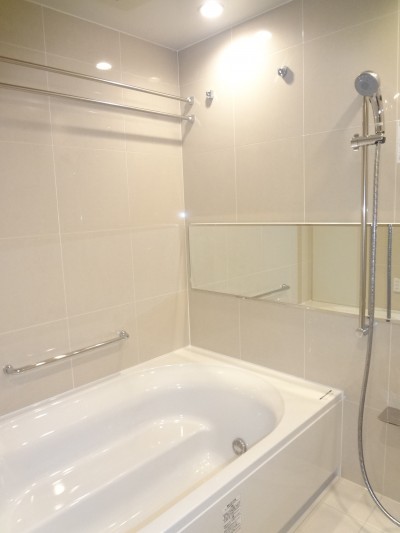 浴室は、淡い色合いで構成されていて、大きな浴槽がより広々とし、清潔感溢れています。
